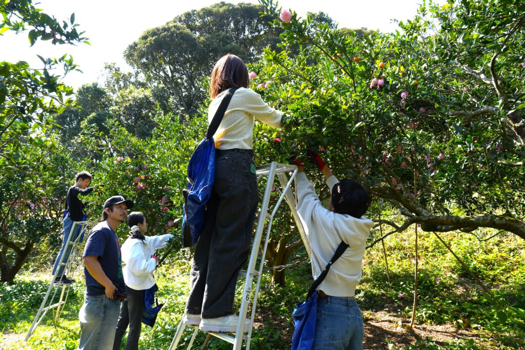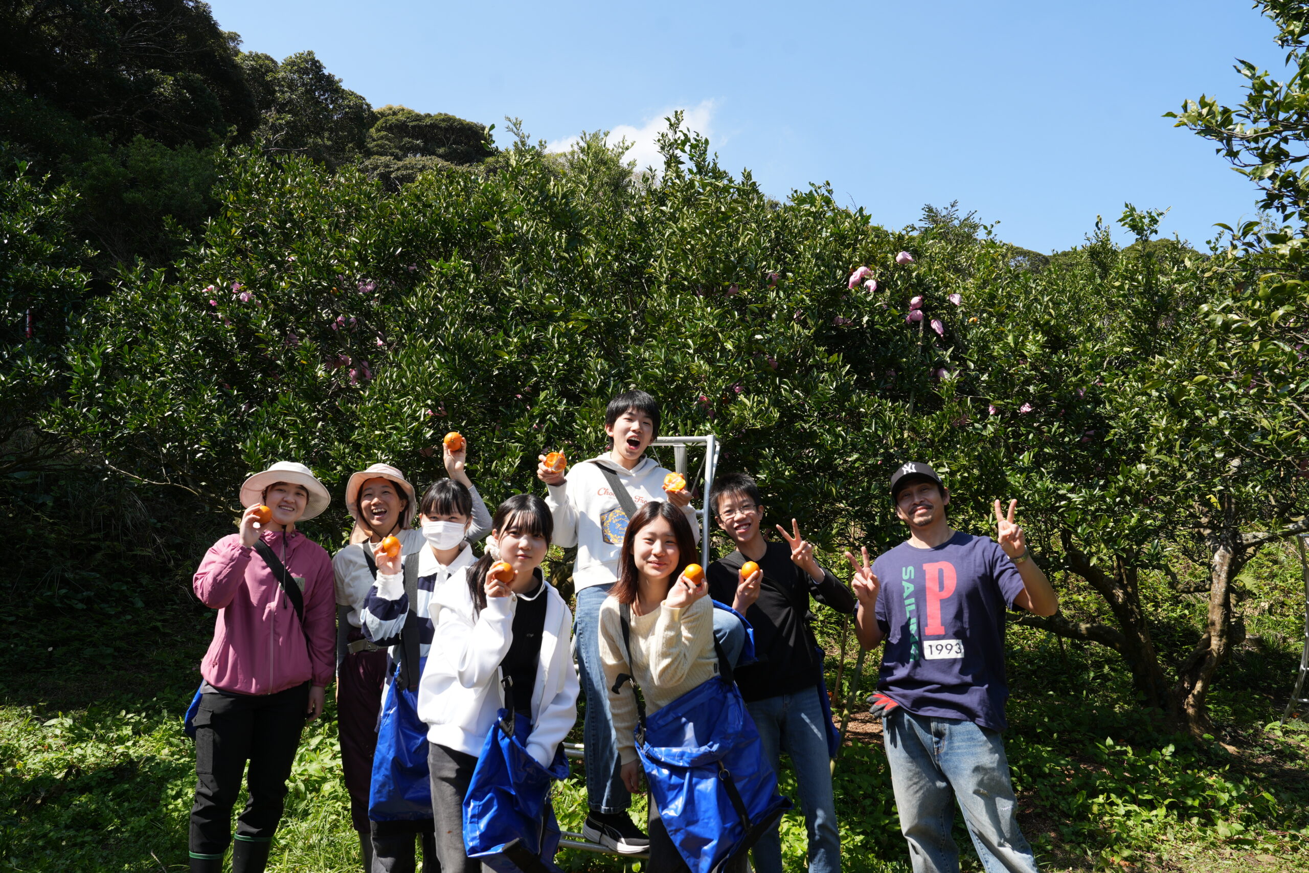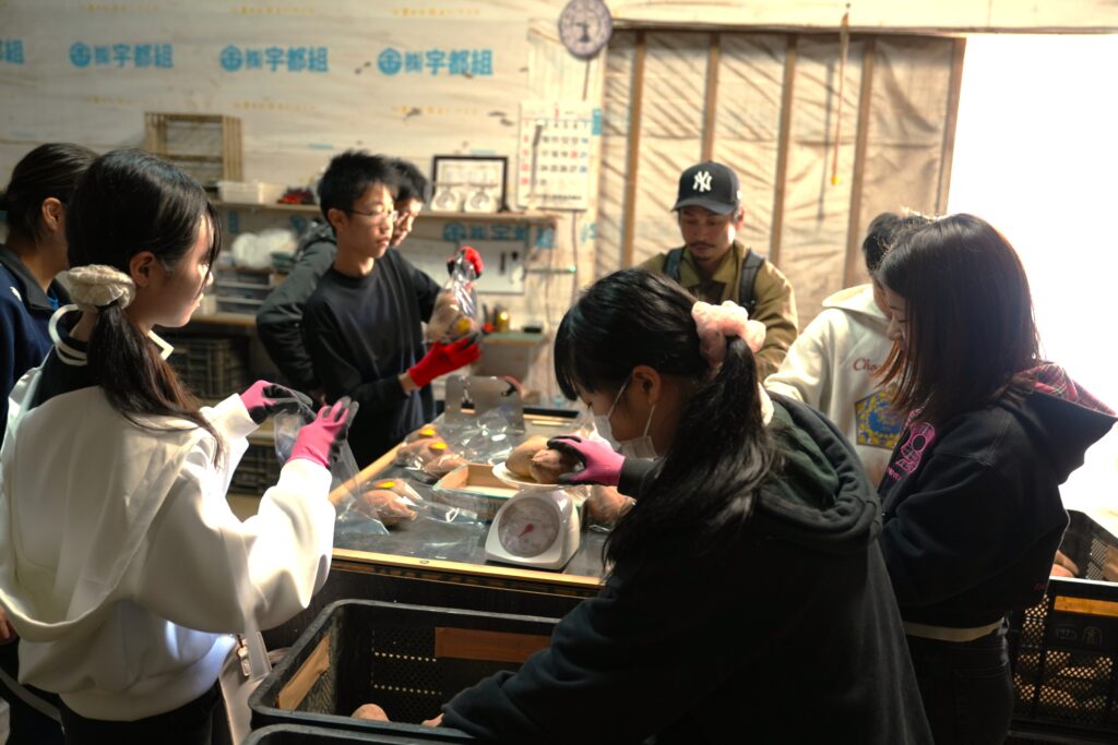 そしてその後は実際の倉庫や圃場へ行き、当日は最高のお天気で、京都から来た10名の中学生のみなさんが、安納芋の計量や袋詰め、たんかんの収穫などの農業体験を行いました。
